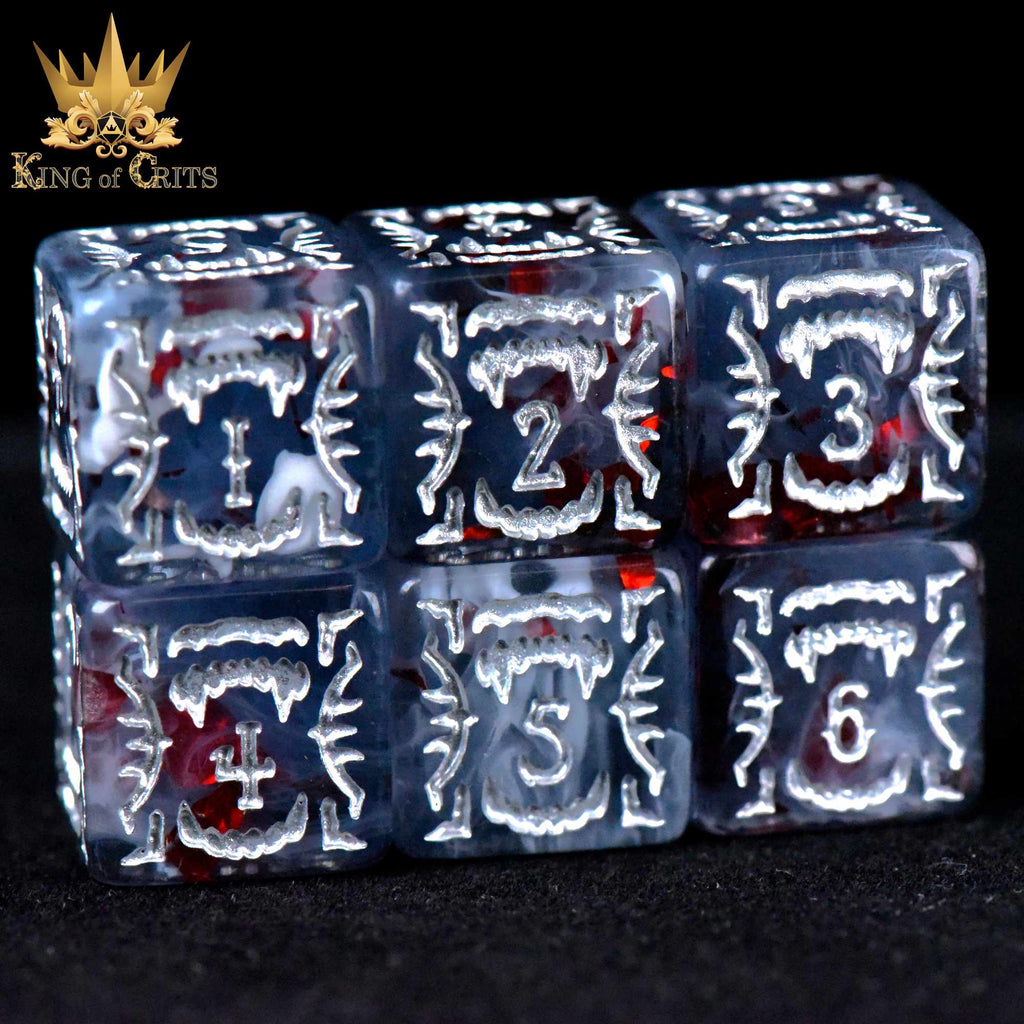 The first drop of blood is always a promise, the promise of a heartbeat that refuses to die. You roll these dice not to seek fortune, but to bind yourself to it. The crimson foil within each face seems to shift when candlelight touches them as if they breathe. When you call upon your vampiric lineage in battle, let these dice decide whether your thirst is a curse… or a weapon.